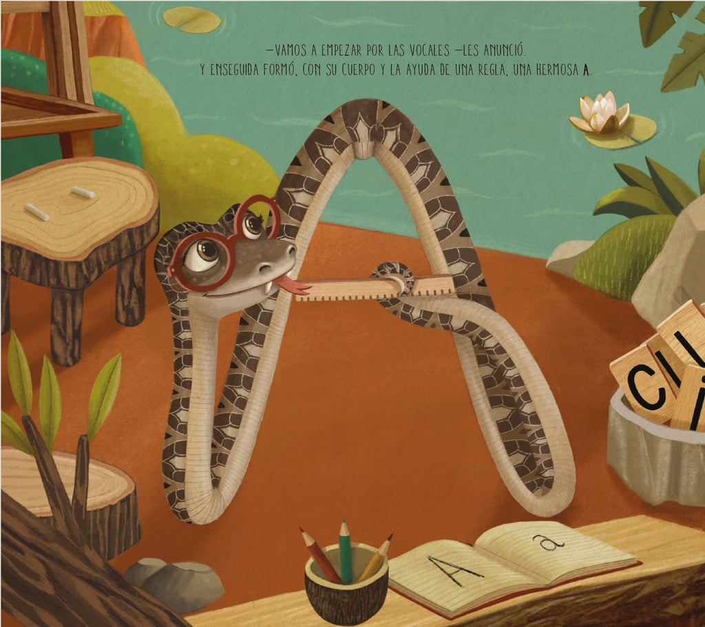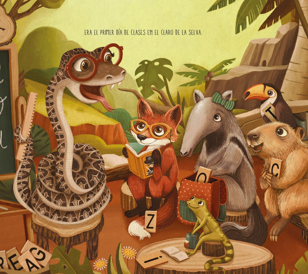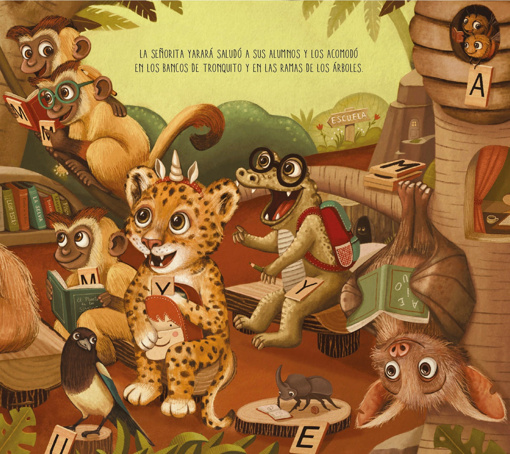 At the jungle school, the animals learn to write their names with Miss Yarará.